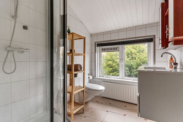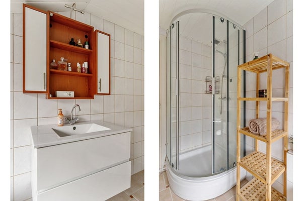 De badkamer is praktisch en voorzien van een wastafelmeubel, douche en toilet.