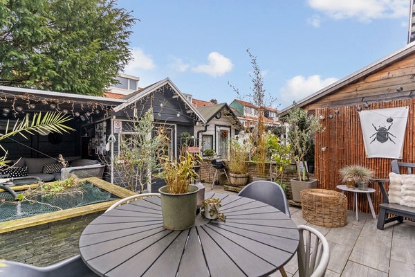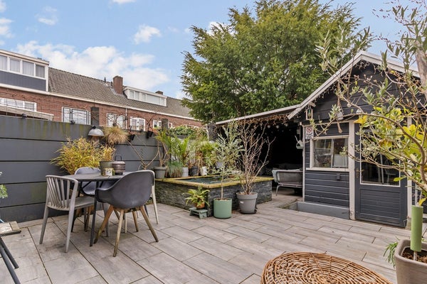 Grenzend aan de woonkamer ligt de zonnige achtertuin gelegen op het zuidwesten. Hier kunnen kinderen naar hartenlust spelen terwijl jij geniet van een goed boek op het terras of onder de veranda. Nog zo’n voordeel: omdat deze woning aan het einde van de rij staat, heb je nét wat meer privacy en een bredere achterom. De tuin is verzorgd aangelegd, gemakkelijk in onderhoud en voorzien van een vijvertje. De schuur biedt praktische bergruimte voor fietsen, tuinspullen en gereedschap.