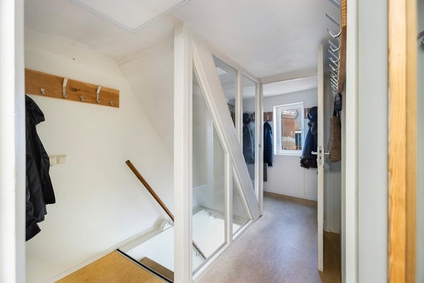 Entree/hal met in het oog springende cortensstalen pui. In de ruime hal plek voor motorfietsen, fietsen, scooters etc. Onder de trap is een handige trapkast gesitueerd;