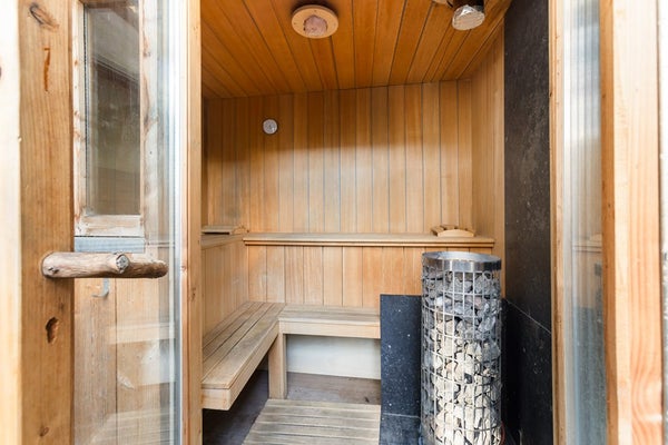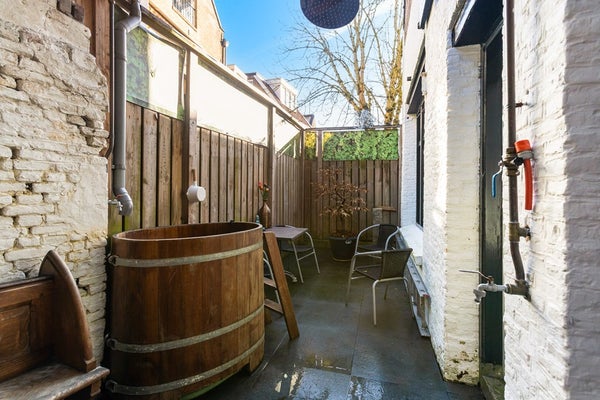 Doorgang naar grote, multifunctionele ruimte met toilet, en directe toegang tot slaapkamer en de achtergelegen stadstuin gelegen op het noordoosten en met veel privacy, voorzien van een echte sauna, dompelbad en buitendouche, de perfecte plek voor ontspanning.
