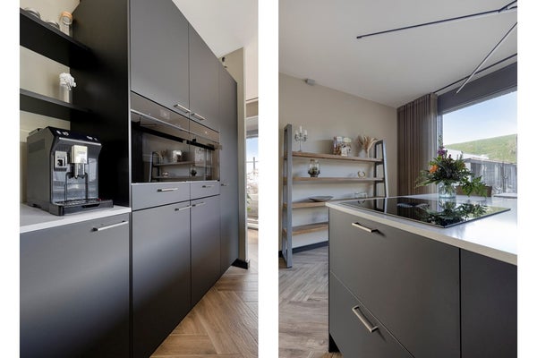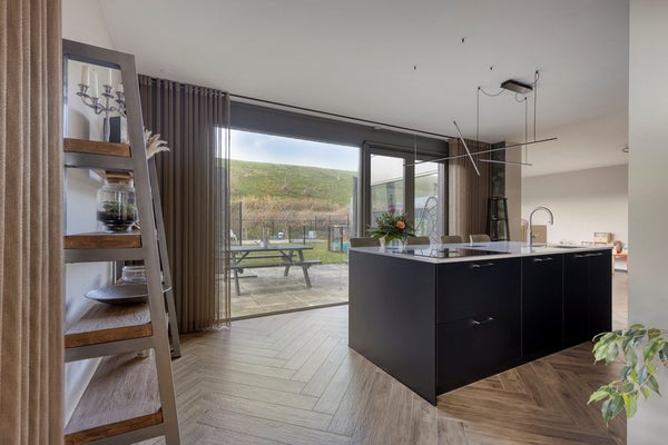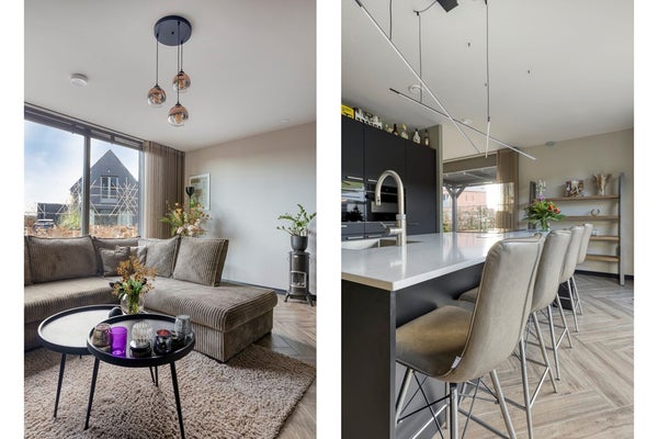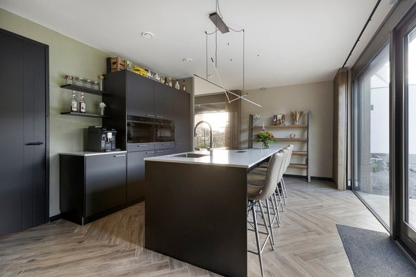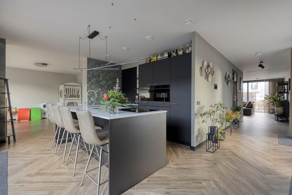 Via de entree kom je binnen in de hal met een separaat toilet. De royale woonkamer is licht en ruim opgezet en staat in open verbinding met de moderne open keuken. De keuken is voorzien van een kook- en spoeleiland, diverse inbouwapparatuur en vormt een fijne centrale plek in huis.