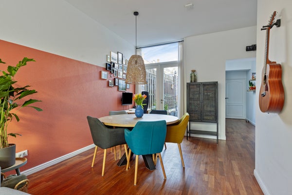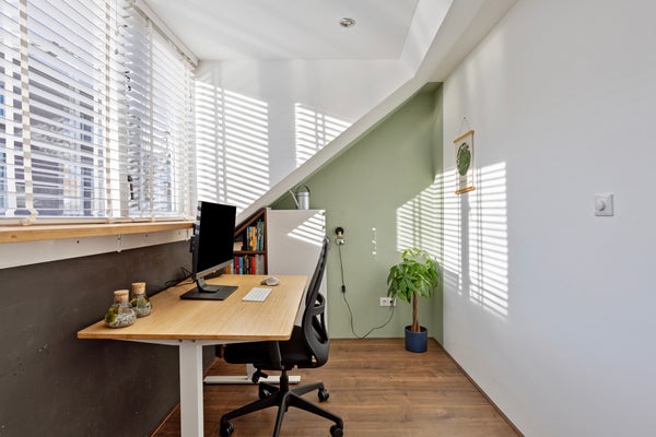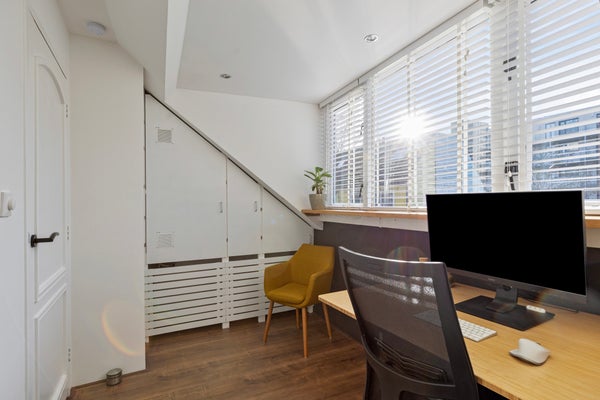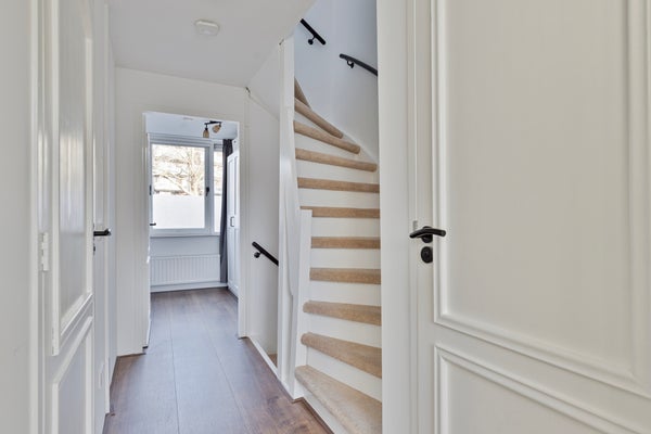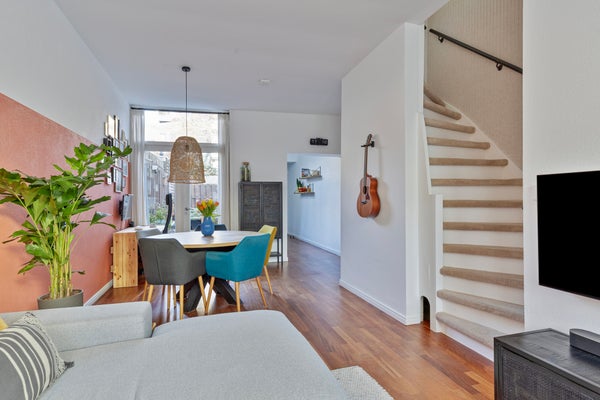 Op de eerste verdieping zijn twee slaapkamers en een moderne badkamer. De tweede verdieping omvat een derde slaapkamer met wastafel en een wasmachine-aansluiting. Met een woonoppervlakte van 89 m² en vier kamers biedt de woning voldoende ruimte. De ligging dichtbij het NS-station, scholen en supermarkten maakt het aantrekkelijk.