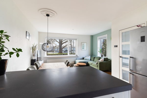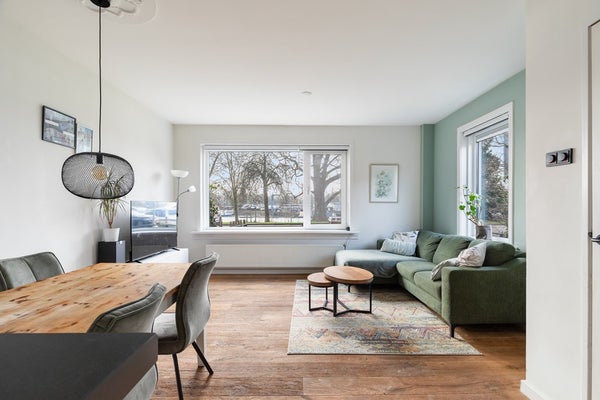 Sfeervolle woonkamer met eikenhouten vloer, veel lichtinval en een schitterend uitzicht over het Wantij. De woning is voorzien van kunststof kozijnen met deels triple beglazing. Vanuit de woonkamer is er toegang tot de moderne open keuken. De woonkamer beschikt aan de voorzijde over elektrische zonwering.