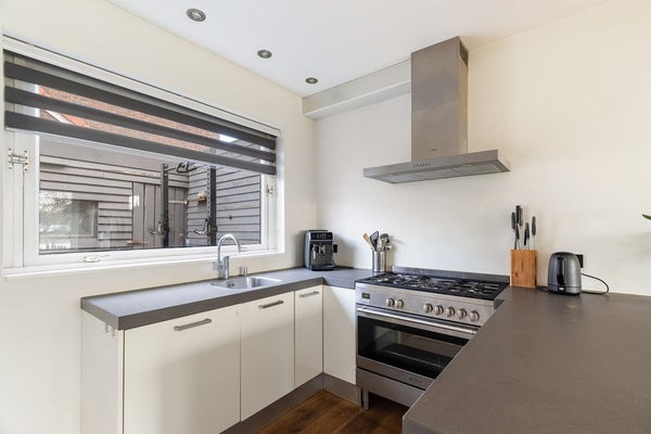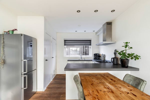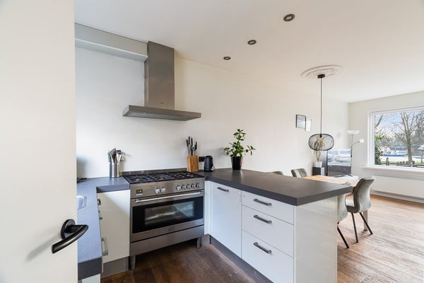 Moderne U-vormige open keuken van het kwaliteitsmerk Bruynzeel, uitgerust met diverse inbouwapparatuur zoals een vaatwasser, kookfornuis met oven en afzuiging. Boven het schiereiland zijn inbouwspotjes geplaatst. Vanuit de keuken is er toegang tot het separate toilet en de achtertuin met berging, welke is voorzien van elektra.