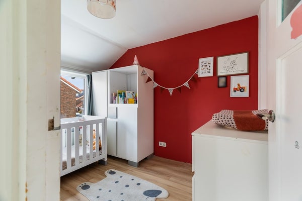 Overloop met toegang tot het toilet en een slaapkamer aan de voorzijde. De verdieping is afgewerkt met laminaatvloeren en strak gestuukte wanden. Via een tussenhal bereikt u de badkamer en de tweede ruime slaapkamer.