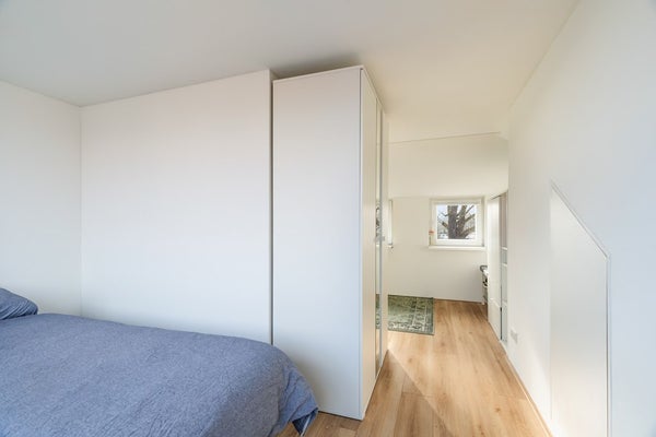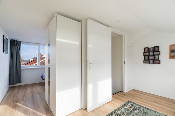 Bereikbaar via een vaste trap. Hier bevinden zich de cv-combiketel (Remeha, 2021, eigendom) en de mechanische ventilatie. Dankzij de dakopbouw aan voor- en achterzijde is hier een volwaardige extra slaapkamer met voorzolder gerealiseerd, voorzien van praktische inbouwkasten.