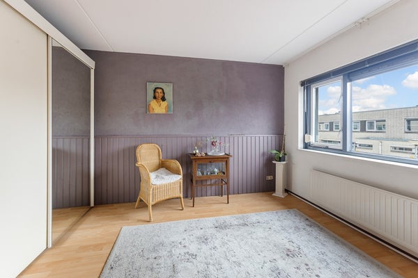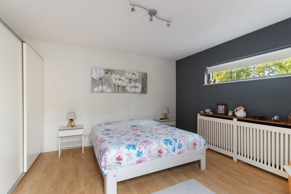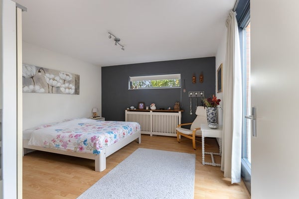 Ruime slaapkamer met extra lichtinval door het zijraam en een kozijn met deur naar het dakterras. Vanaf het terras heb je zicht op de achtertuin.