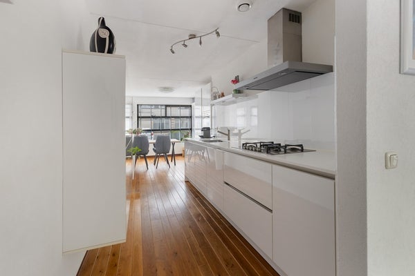 Aan de zijkant van de woning bevindt zich een nette hoogglans keuken, uitgerust met diverse inbouwapparatuur: nieuw geplaatste vaatwasser (siemens), oven, combimagnetron en een 5-pits gasfornuis met afzuiging.