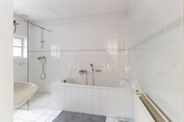 Ruim betegelde badkamer in neutrale kleurstelling met ligbad, inloopdouche, wastafel en toilet. De badkamer is voorzien van mechanische ventilatie, een raam natuurlijke ventilatie en een radiator.