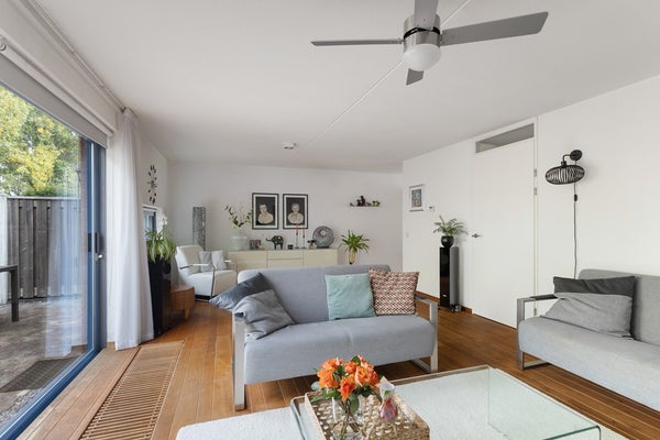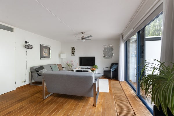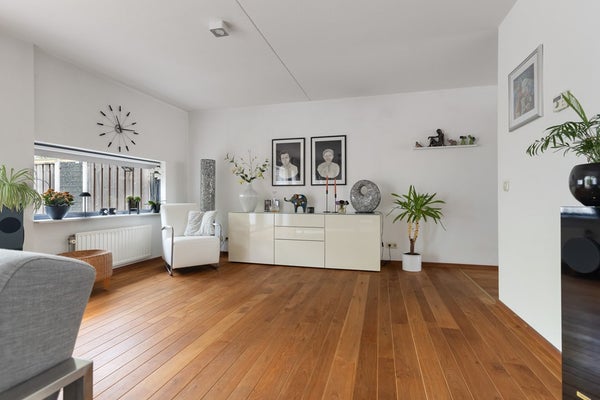 Binnen valt direct het gevoel van ruimte en licht op. De grote raampartijen en schuifpui zorgen voor een zonnige woonkamer, terwijl het eiken parketvloer meteen een warme, huiselijke sfeer geeft.