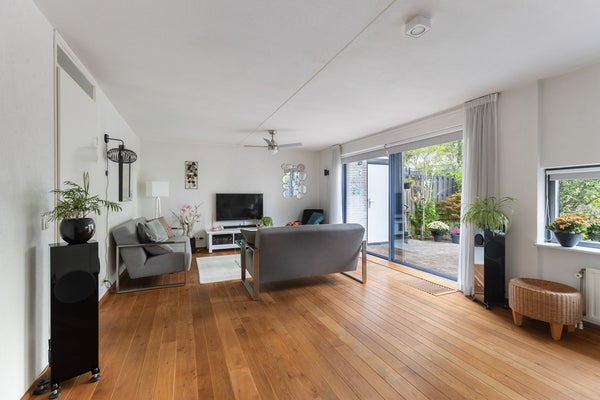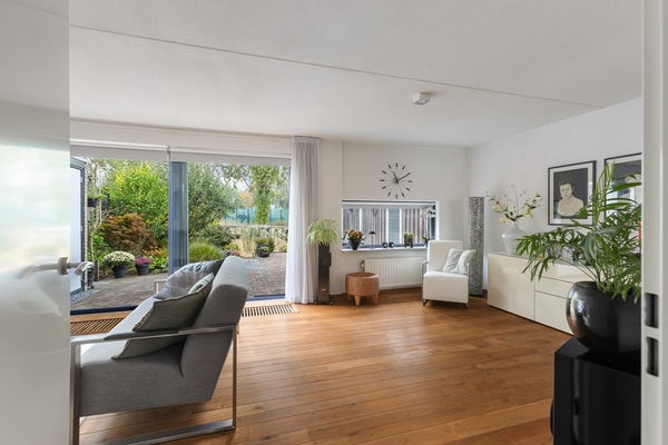 Lichte, tuingerichte woonkamer met een royale aluminium schuifpui die zorgt voor veel natuurlijk licht. De vloer is voorzien van een eikenhouten vloer. De woonkamer is voorzien van een convector put, waarbij tocht in de winter verleden tijd is.