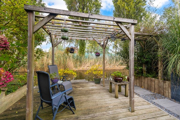 Het terras met pergola grenst aan het water en is gelegen op het zonnige zuidwesten.