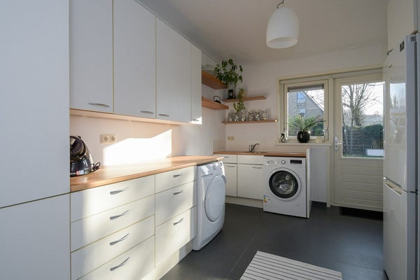 De moderne luxe keuken beschikt over diverse inbouwapparatuur, waaronder; vaatwasser, inductiekookplaat, heteluchtoven, magnetron en koel/vries combinatie. In de ruime woonkamer en keuken ligt een mooie plavuizen vloer met vloerverwarming. De woonkamer met sfeervolle houtkachel is tuingericht en uitgebouwd aan de achterzijde. Door de vele raampartijen en de grote schuifpui geniet je hier van maximale lichtinval en betrek je de tuin en terras bij de woonruimte. De woonkamer biedt toegang tot de geïsoleerde bijkeuken waar zich de witgoed-aansluitingen, de HR CH ketel en het boilervat t.b.v. het verwarmen van het tapwater bevinden. Vanuit de bijkeuken kom je in de garage en is er toegang tot de tuin.