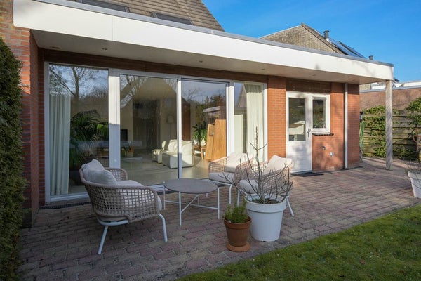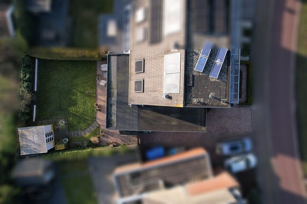 De achterzijde van de woning is voorzien van een stijlvolle uitbouw met fraaie overstek. Door de vele raampartijen en de grote schuifpui geniet je hier van een maximale lichtinval en betrek je terras en de tuin, op het zuiden gelegen, bij de woonruimte. De begane grond beschikt over een plavuizen vloer met comfortabele vloerverwarming. De moderne luxe leefkeuken voldoet aan alle hedendaagse wensen.