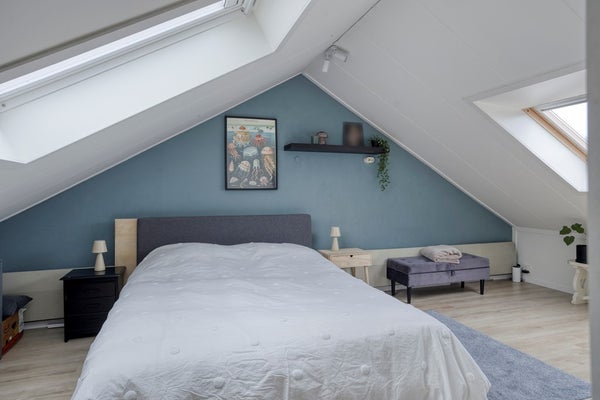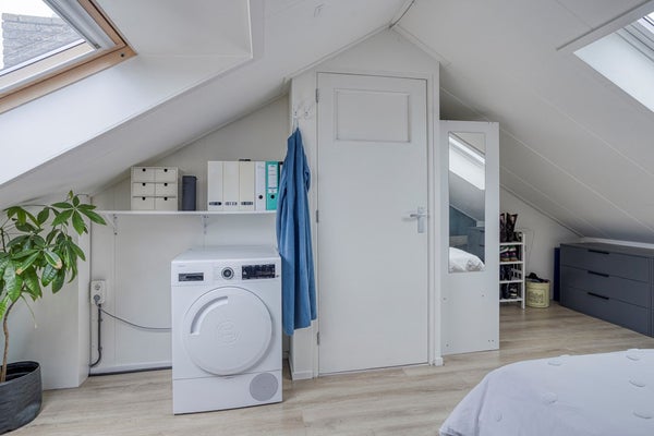 Tweede verdieping: Via een vaste trap bereikbaar naar vierde slaapkamer, voorzien van grote dakramen voor extra daglicht. Hier tevens een kast waarin de cv-opstelling en eveneens aansluiting voor wasmachine en droger.