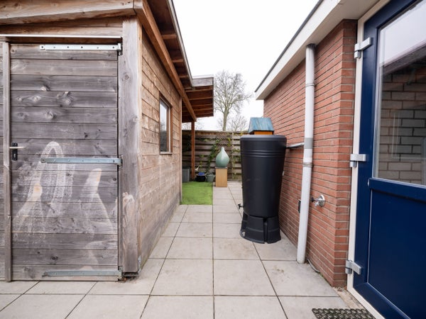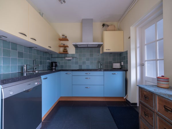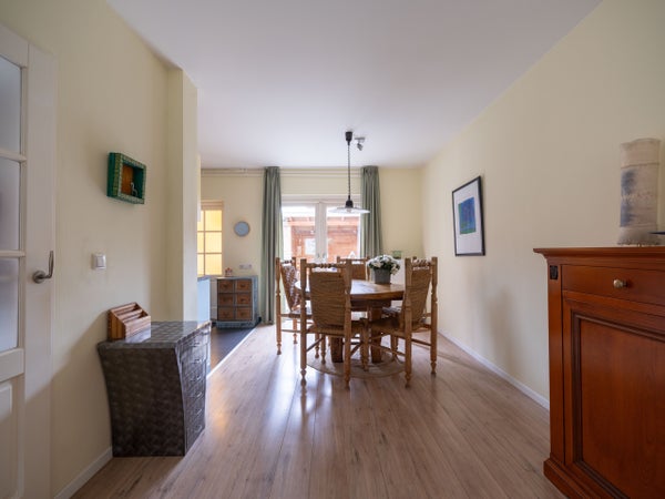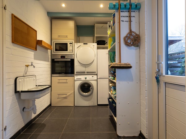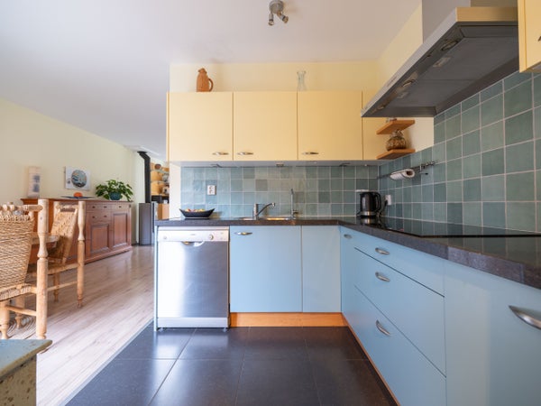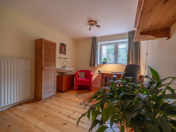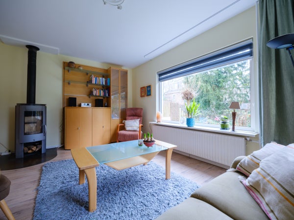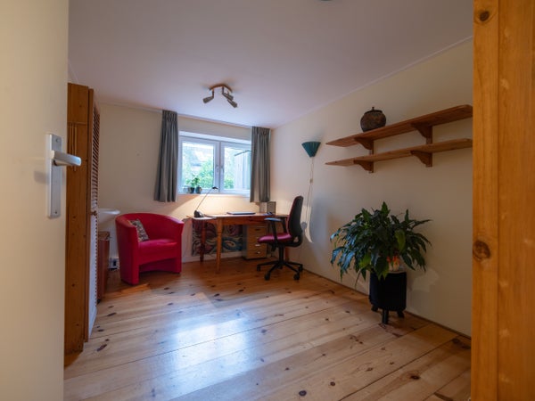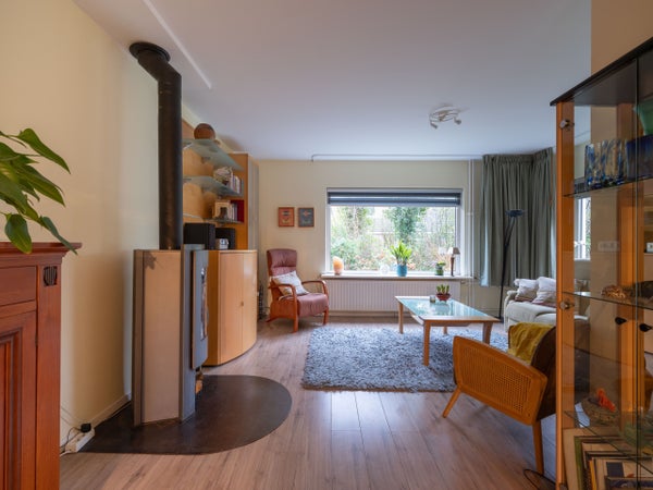 De indeling op de begane grond omvat een entree met een modern toilet, een ruime woonkamer met houtkachel en openslaande tuindeuren naar de zonnige tuin. De halfopen keuken is recent vernieuwd en heeft inbouwapparatuur. De bijkeuken biedt ruimte voor een wasmachine en droger, met toegang tot de slaapkamer die kan dienen als werkkamer.