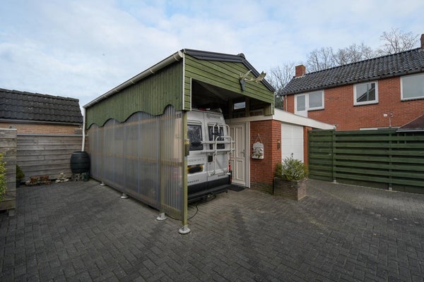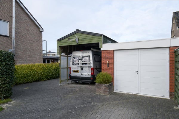 Via de entree kom je in de ruime bijkeuken waar zich de witgoed aansluitingen en de CV ketel, AWB met bouwjaar 2003 bevinden. Via een schuifpui krijg je toegang tot het zonnige terras. Vanuit de bijkeuken krijg je toegang tot de inpandige garage met een oppervlakte van 28 m2. De garage beschikt over openslaande garagedeur van kunststof. Naast de garage bevindt zich een verhoogde overkapping geschikt voor de camper of caravan. In 2016 is er spouwmuurisolatie en isolatie in de kruipruimte (EPS korrels) toegepast.