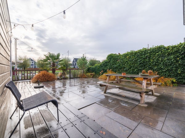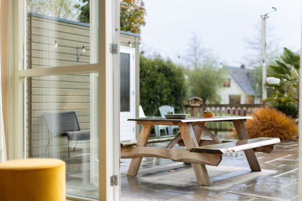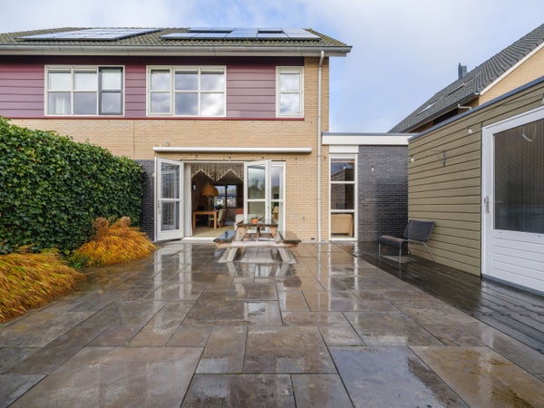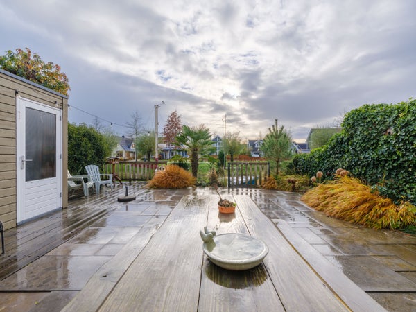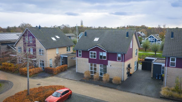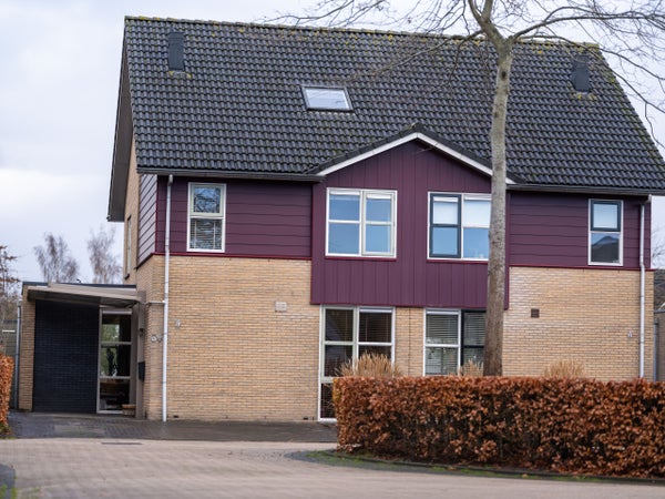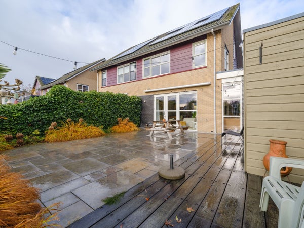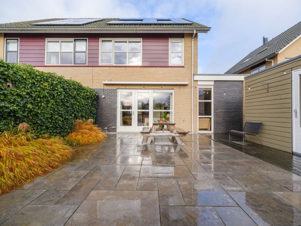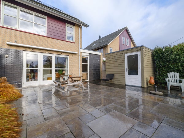 Buitenruimte met een onderhoudsarme tuin, een houten berging voor fietsen, een ruime oprit en een zwevende carport maken het geheel compleet.