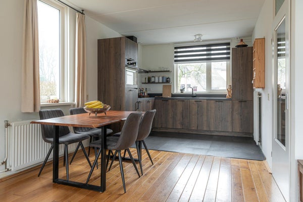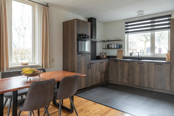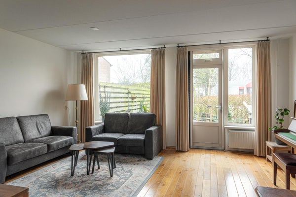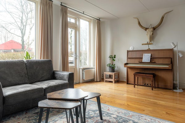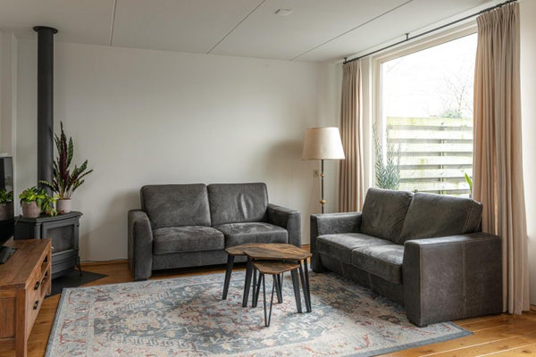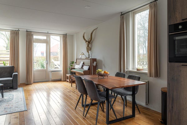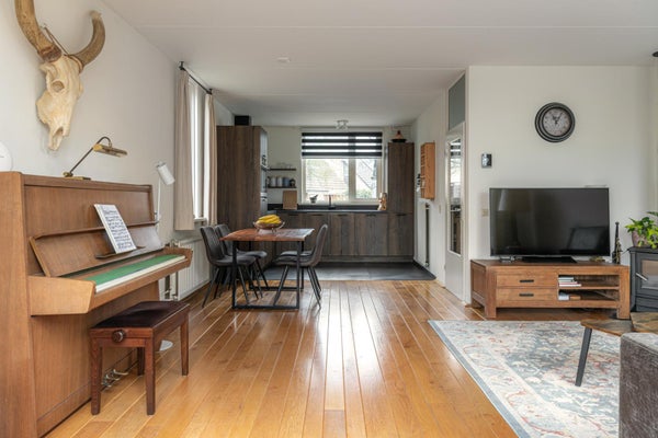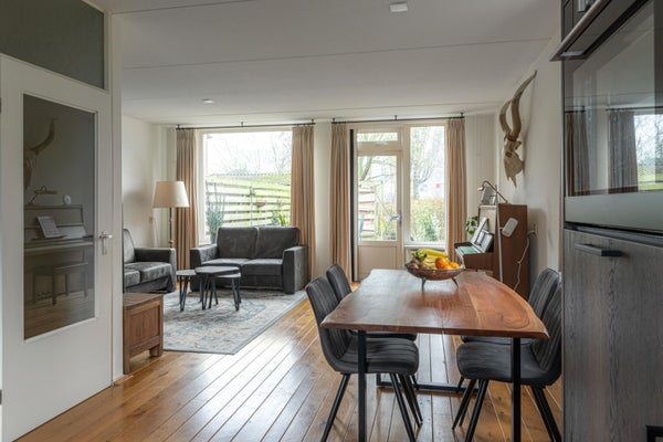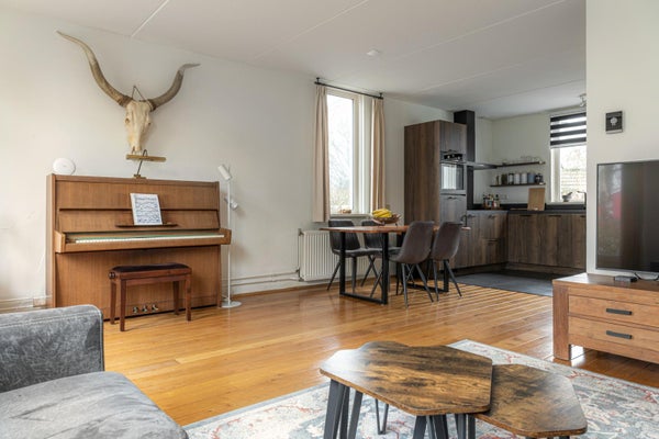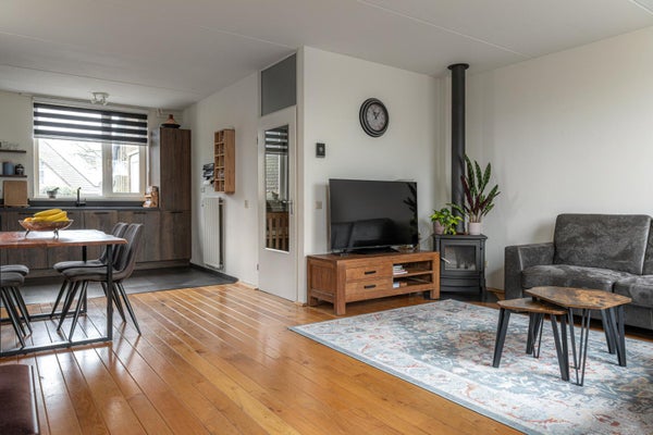 De ruime lichte woonkamer heeft een tuindeur direct naar de tuin op het zuiden. In de hoek nog een houtkachel die in de woning blijft voor de kille momenten in het jaar is dit echt heerlijk comfortabel verwarmen.