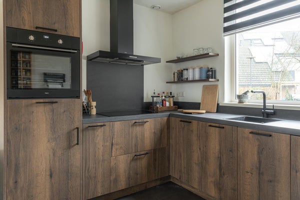 De keuken die erg uitgebreid is met natuurlijk de nodige inbouwapparatuur. Een inductiekookplaat, oven, koelkast en vriezer en alles in een moderne kleurstelling met donker blad.