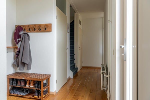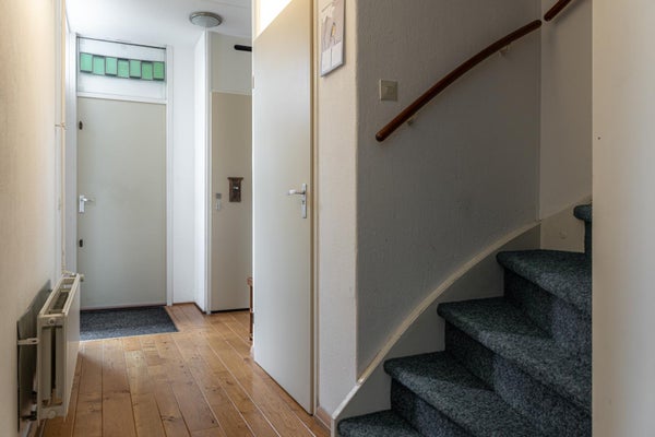 Entree, hal met meterkast, trapopgang met een kastruimte onder de trap, modern nieuw toilet en vanuit de hal kun je ook in de bijkeuken komen.