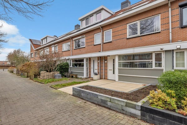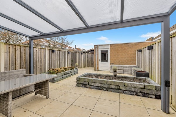 De ruime, tuingerichte woonkamer is afgewerkt met een laminaatvloer en strak gestuukte wanden. Onder de trap bevindt zich een praktische vaste bergkast. Via openslaande deuren is er toegang tot de fraai aangelegde tuin met moderne serre, waar u optimaal van het buitenleven kunt genieten. Tevens is er een vrijstaande stenen berging en een achterom naar de privéparkeerplaats.