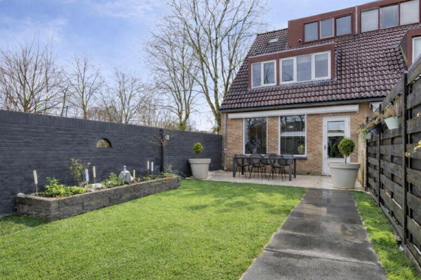 Op het westen en dus zonnige achtertuin met overkapping. Tevens een berging en achteruitgang naar het achterpad.