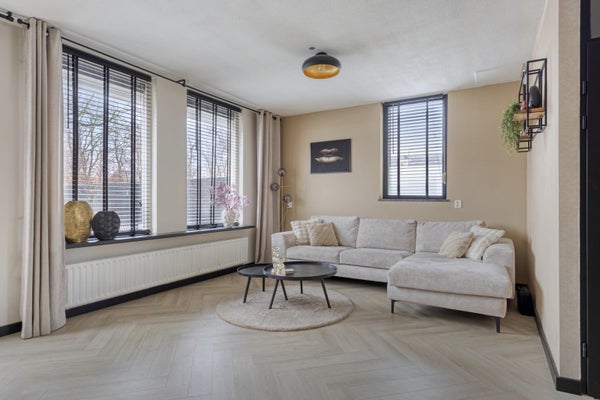 Tuingerichte woonkamer met prachtige visgraad vloer en nette wand en plafond afwerking, handig is de berg-