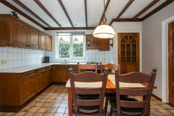 De open keuken is ruim opgezet in een hoekopstelling en beschikt over een raam aan de zijkant, wat zorgt voor extra licht en zicht op het groen. De indeling is functioneel en prettig in gebruik, al is de keukeninrichting gedateerd – een mooie kans om deze volledig naar eigen wens te vernieuwen.