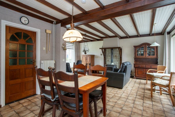 De ruimte is afgewerkt met een tegelvloer, rustige wandafwerking van behang en een karakteristiek balkenplafond dat bijdraagt aan een warme uitstraling.