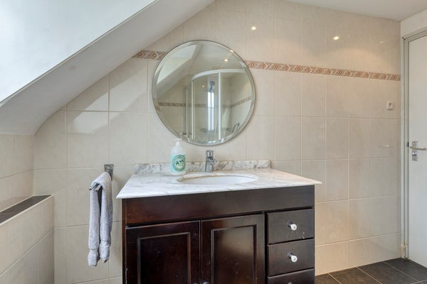 Op de verdieping bevinden zich de overloop, 3 slaapkamers en de badkamer. De slaapkamer zijn respectievelijk ca. 8, 7 en 7 m² groot en twee slaapkamers zijn voorzien van een muurkast. De badkamer is voorzien van een douche, wandcloset en een wastafel met meubel.