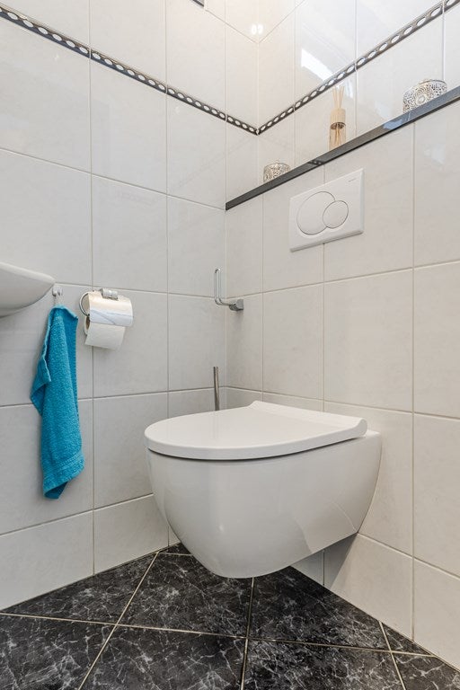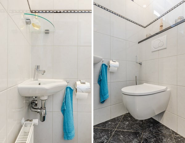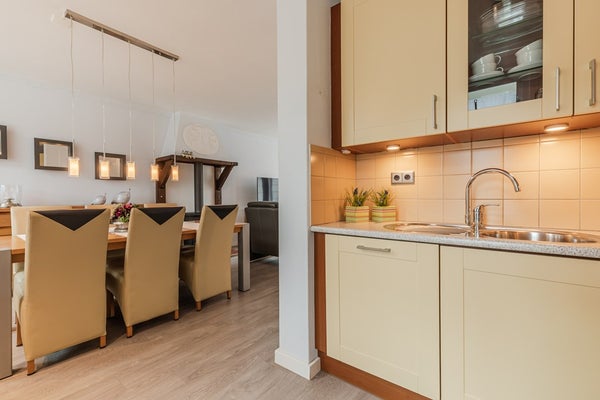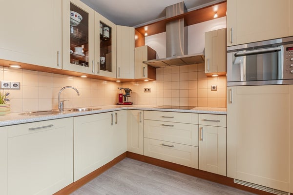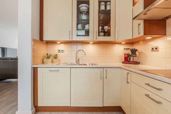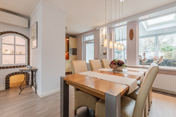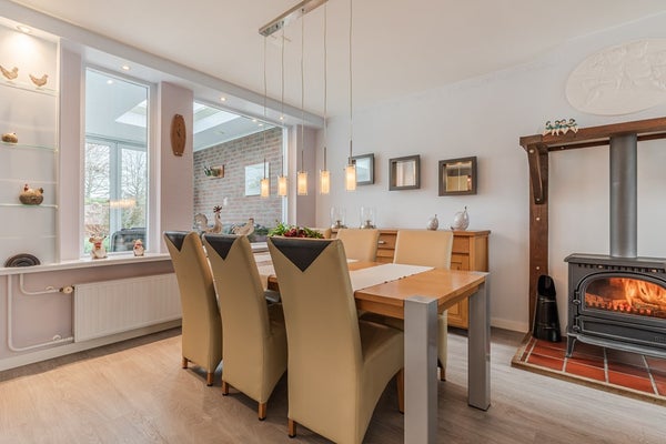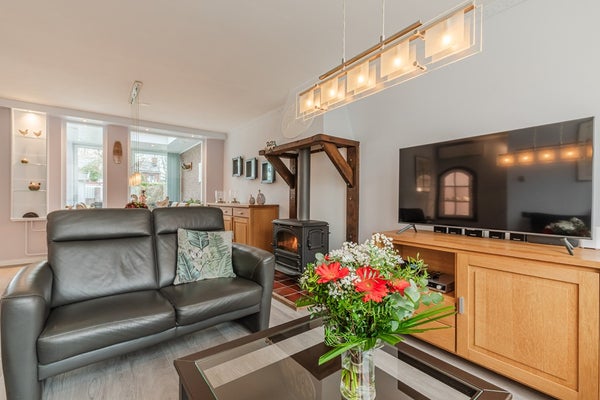 Hal, zwevend toilet met fonteintje, sfeervolle woonkamer (28 m²) met een moderne pvc vloer en houtkachel, open keuken (6 m²) met een complete inbouwkeuken v.v. een kookplaat, afzuigkap, combi magnetron, koelkast en vaatwasser, royale tuinkamer (24 m²) met tegelvloer en schuifpui, inpandige garage (17 m²) met verwarming en aansluiting voor wasmachine.