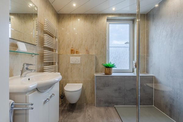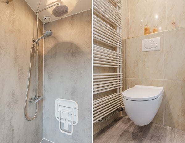 Overloop met airconditioning, 3 slaapkamers (13 m², 12 m² en 9 m²) met laminaatvloer, moderne badkamer (6 m²) met inloopdouche, wastafel met meubel en een zwevend toilet.