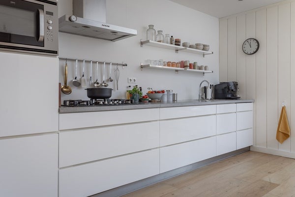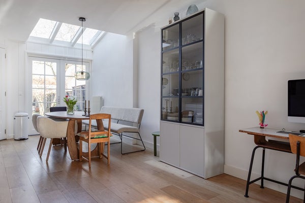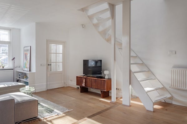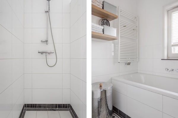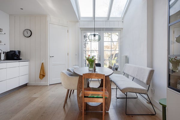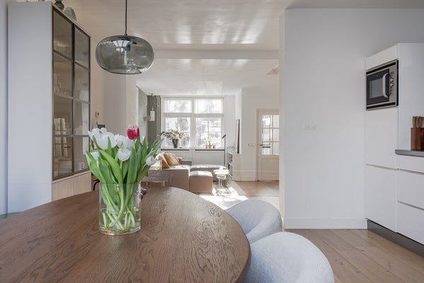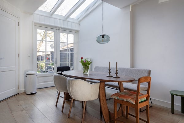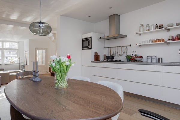 De woonkamer is voorzien van een luxe massief houten vloer en biedt door de gunstige ligging bijna rondom raampartijen. Dit zorgt in combinatie met de openslaande deuren en lichtstraat aan de achterzijde voor een heerlijk lichte ruimte. De open keuken is modern afgewerkt en voorzien van vloerverwarming en diverse soorten keukenapparatuur zoals een combimagnetron, koel/vriescombi, vaatwasser en afzuigkap. Koken geschiedt op gas en in de achtergelegen bijkeuken bevindt zich een inbouwkast voor de wasmachine/droger. Vanuit deze ruimte is toegang tot een aparte vliering met veel opbergruimte met stahoogte en de cv-ketel (2021). De badkamer en het toilet zijn tevens netjes afgewerkt en de badkamer is voorzien van een inloopdouche, ligbad en dubbele wastafel. Zowel de bijkeuken, de badkamer en het toilet zijn net als de keuken voorzien van vloerverwarming.