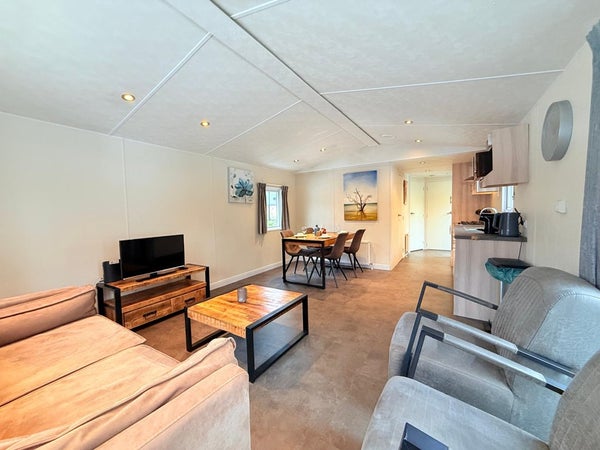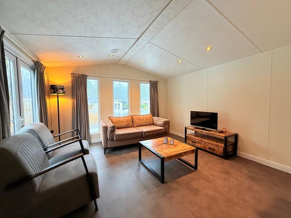 De woonkamer is warm en uitnodigend ingericht en vormt een prettige leefruimte om samen te ontspannen. Dankzij de rustige ligging en het uitzicht op het water hangt hier een kalme, ontspannen sfeer. Een plek waar u moeiteloos tot rust komt na een dag in de natuur.