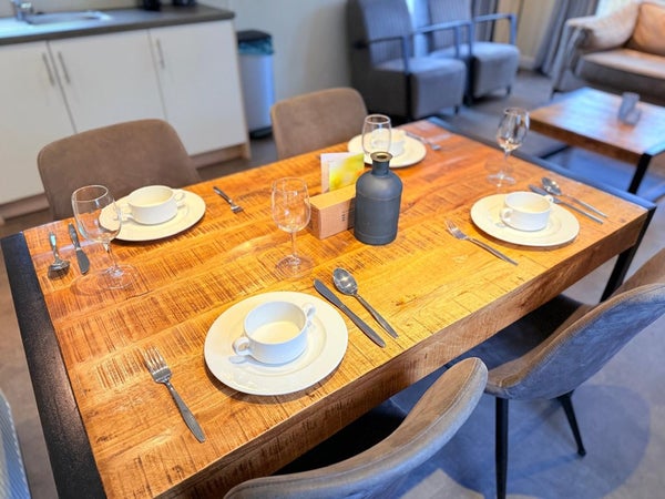 De eethoek sluit aan op de woonkamer en biedt ruimte om met vier personen comfortabel te tafelen. Ideaal voor lange ontbijtjes, gezellige diners of een ontspannen spelletje in de avonduren.