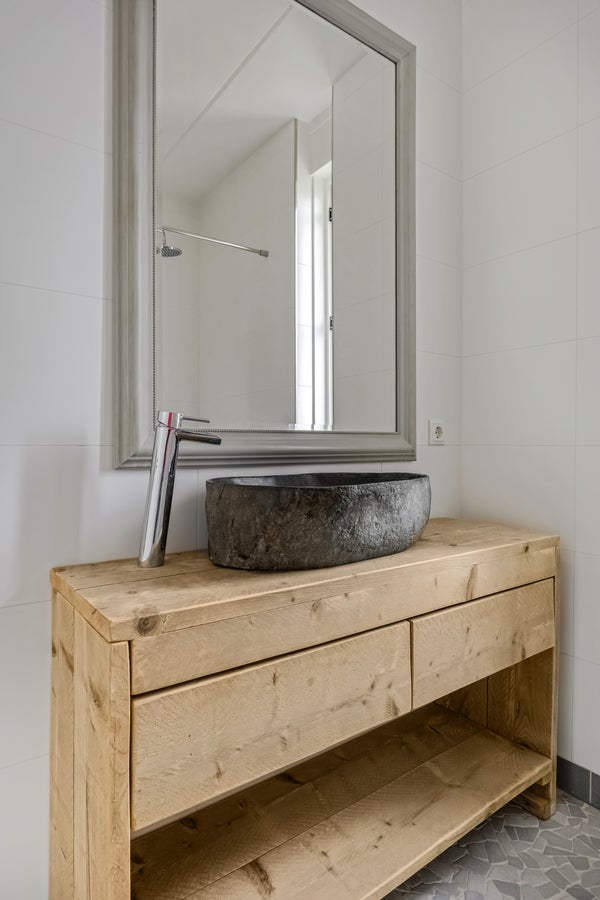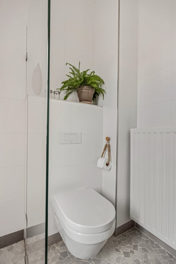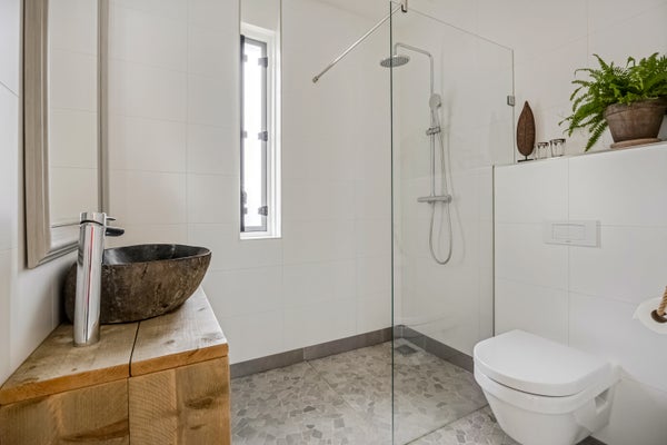 De badkamer, met een raam in de voorgevel, is uitgevoerd in dezelfde stijl als de toiletruimte op de begane grond. De inloopdouche is voorzien van een glazen wand, wat bijdraagt aan de open en lichte uitstraling. Op het plateau boven het toilet is ruimte voor persoonlijke accessoires, terwijl het badmeubel met wastafel het geheel compleet maakt en zorgt voor een verzorgde afwerking.