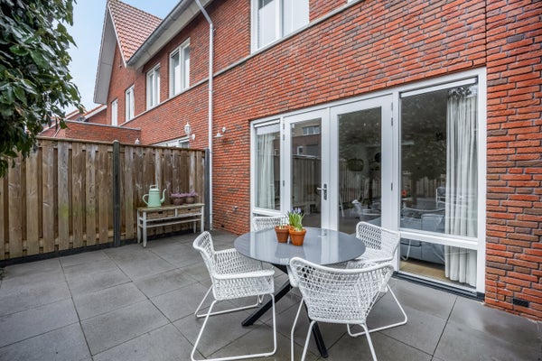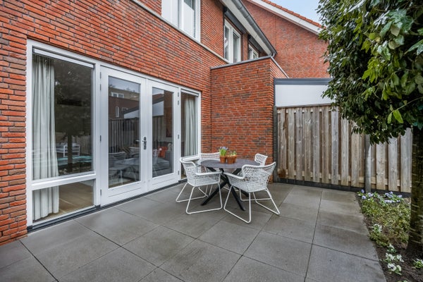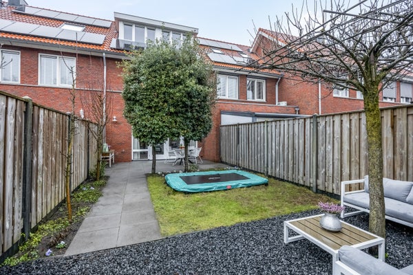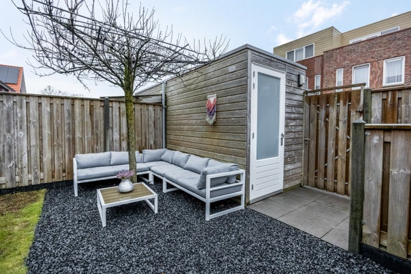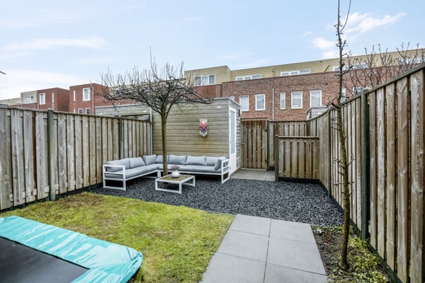 Via de openslaande deuren in de woonkamer betreed je de achtertuin, een groene en zonnige buitenruimte. De tuin is met zorg ingericht en beschikt over twee terrassen, waarvan één sfeervol is gesitueerd onder de beschutting van een boom. Aan beide zijden zorgen de houten schuttingen voor een aangenaam gevoel van privacy. Achterin de tuin bevindt zich een houten berging met ruimte voor meerdere fietsen en tuingereedschap. Via de poort achterom is de steeg eenvoudig bereikbaar.