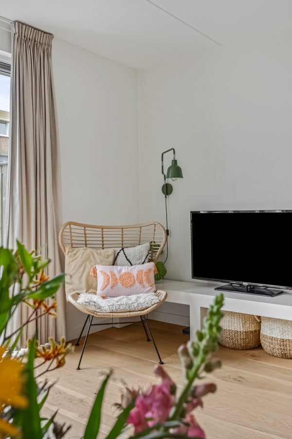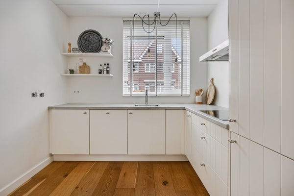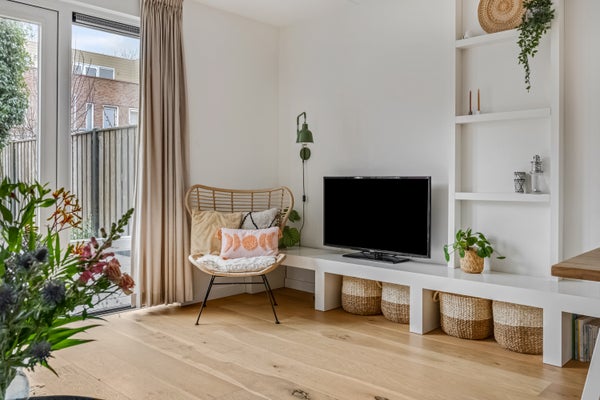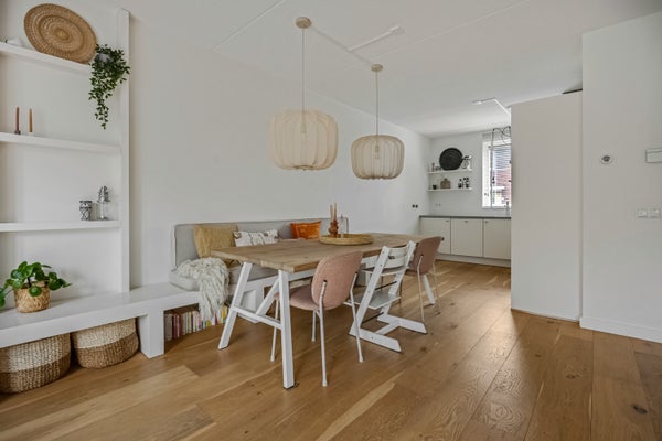 De woonkamer kenmerkt zich door een maatwerk wandmeubel dat een mooi geheel vormt met de bank bij het eetgedeelte. De eikenhouten vloer laat zich goed combineren met uiteenlopende interieurstijlen en extra bergruimte is er in de kast onder de trap. Aan de achterzijde van de woning bevindt zich het royale zitgedeelte van de woning met openslaande deuren naar de tuin en het eetgedeelte grenst aan de open keuken. De keuken in hoekopstelling met een lichtgrijs werkblad heeft een moderne en verzorgde uitstraling. Alle benodigde apparatuur is aanwezig, waaronder een keramische kookplaat, afzuigkap, vaatwasser, combi-oven, koelkast en vriezer. De open planken boven het aanrecht blijven achter en bieden ruimte om je mooiste keukenaccessoires een plekje te geven.