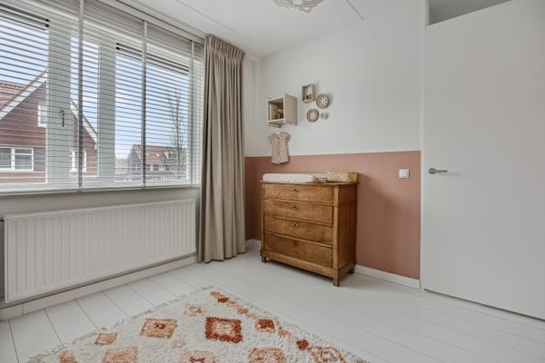 Op de eerste verdieping komen licht en leefruimte samen. Hier bevinden zich 3 slaapkamers en de badkamer. Het gevoel van ruimte wordt versterkt door de lichte laminaatvloer, die vrijwel over de gehele verdieping is doorgelegd. Aan de achterzijde van de woning zijn twee slaapkamers die momenteel in gebruik zijn als master bedroom en een stijlvolle kleedruimte. De ruime slaapkamer aan de voorzijde onderscheidt zich door de geschilderde lambrisering, die direct een warme en speelse sfeer toevoegt.