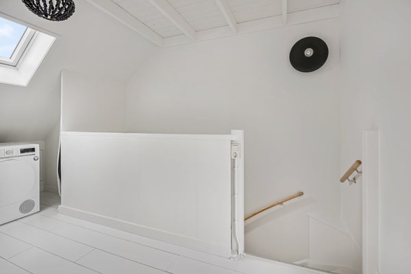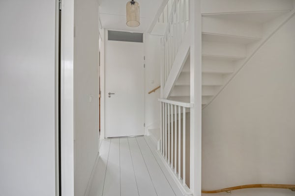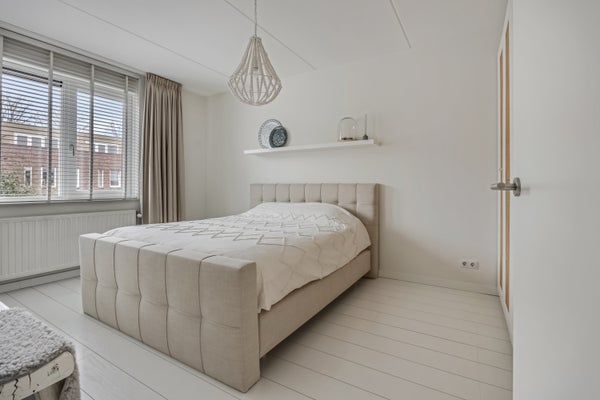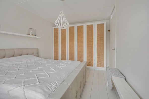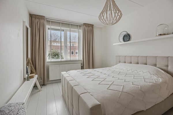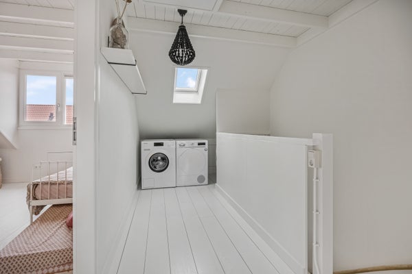 De tweede verdieping heeft dankzij de twee dakkapellen een aangename hoeveelheid extra ruimte en daglicht. Hier bevinden zich twee volwaardige slaapkamers en een praktische overloop met een wasmachine aansluiting. De doorlopende witte vloer, in combinatie met het balkenplafond en de lichte wandafwerking, zorgt voor een fijne sfeer waarin het ruimtelijk karakter van deze verdieping volledig tot zijn recht komt.