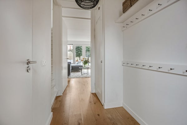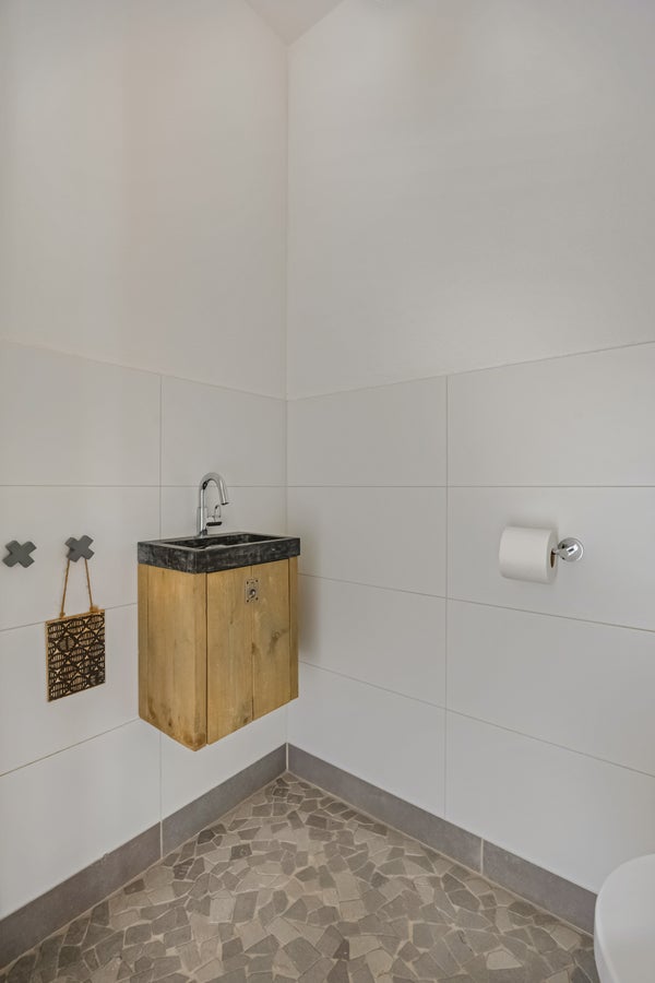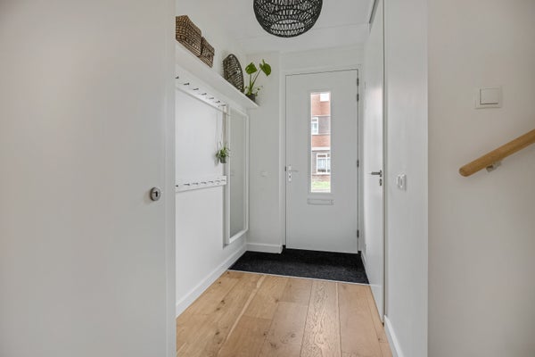 Deze woning valt direct op door de dakkapellen op de tweede verdieping. Via de overdekte entree betreed je de woning door de antracietkleurige voordeur, die toegang geeft tot de verzorgde hal. Hier tref je, net als in de woonkamer en keuken, eikenhoutenvloer met vloerverwarming. Links van de hal, naast de trapopgang, is de toiletruimte, uitgevoerd met stijlvol sanitair en een uitgesproken vloerafwerking.