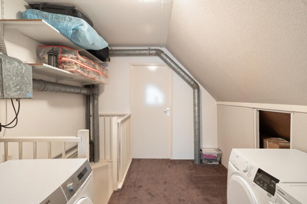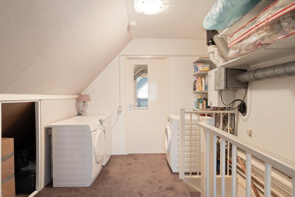 Via een vaste trap bereiken we de zolderverdieping. Op de voorzolder bevinden zich de wasmachineaansluiting en de cv-ketel.