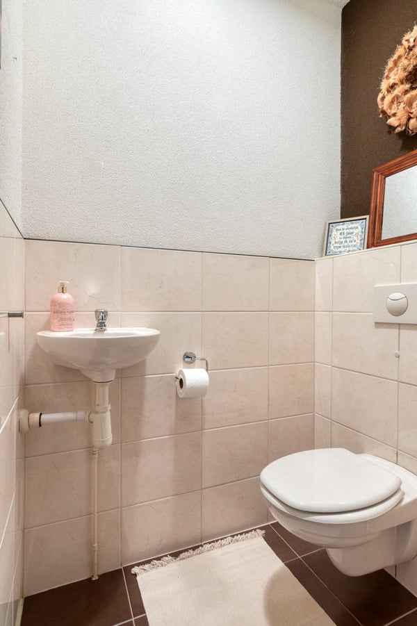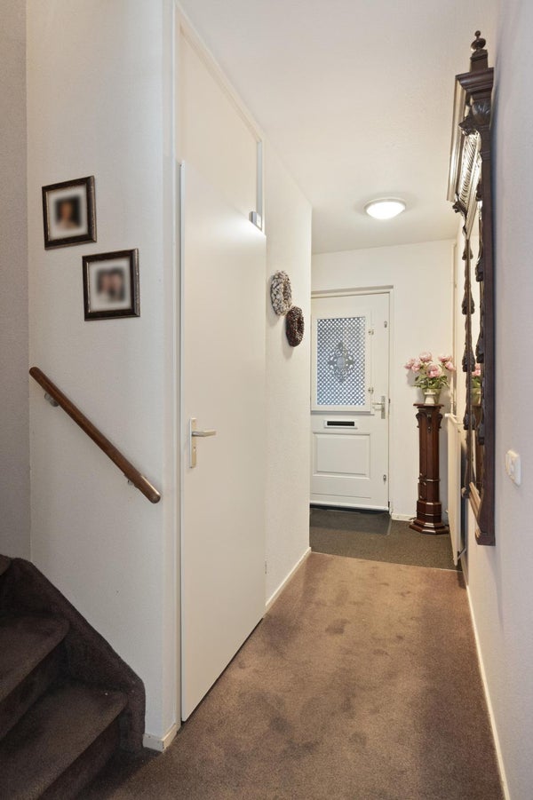 Via de verzorgde voortuin bereiken we de entree van de woning. De ruime hal biedt toegang tot de trapopgang naar de eerste verdieping, de toiletruimte met zwevend toilet en fonteintje, en de doorgang naar de woonkamer en keuken.