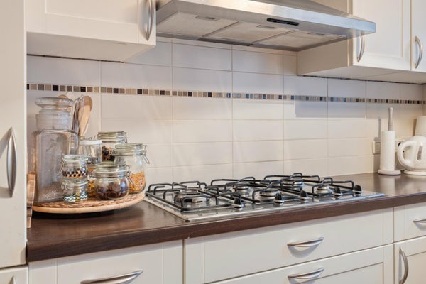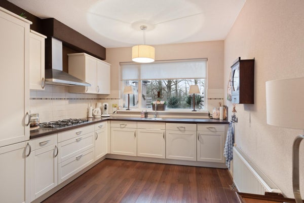 De keuken is opgesteld in een praktische L-vorm en uitgevoerd in een frisse witte kleurstelling. Deze is voorzien van diverse inbouwapparatuur, waaronder een groot 5-pitsfornuis, ideaal voor het bereiden van uitgebreide maaltijden.