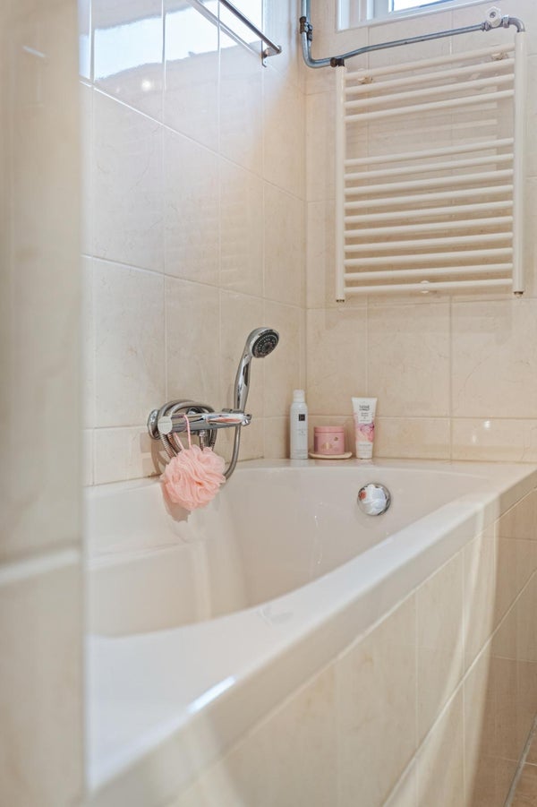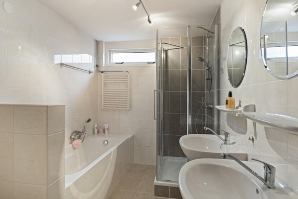 De complete badkamer is van alle gemakken voorzien en beschikt over dubbele wastafels, een ruime douche, een ligbad en een tweede zwevend toilet, comfortabel en praktisch voor het hele gezin.