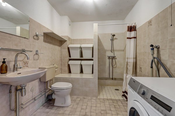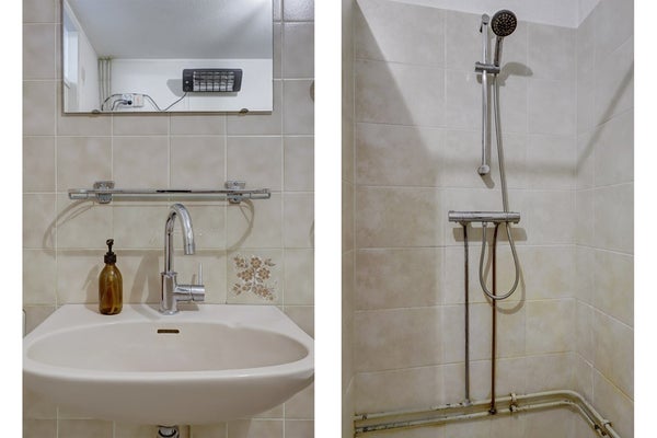 De badkamer is uitgerust met een wastafel, inloopdouche, een tweede toilet en aansluiting voor de wasmachine.