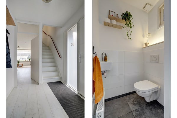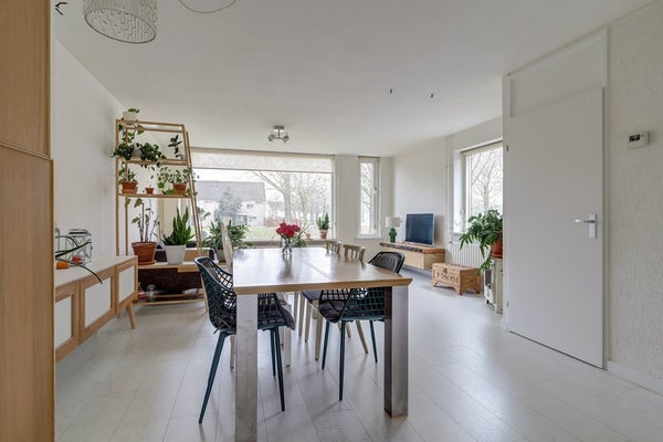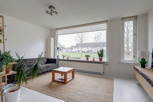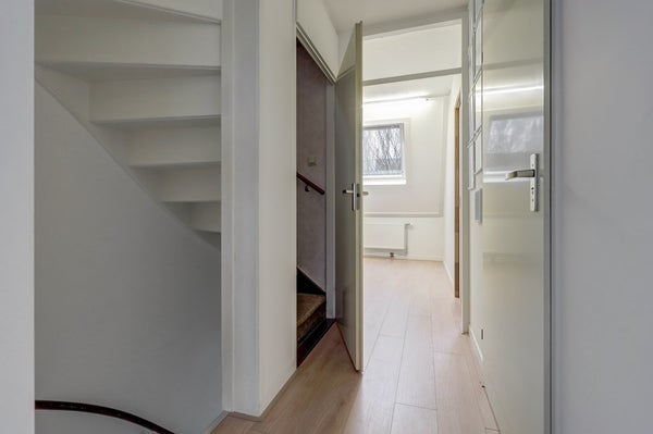 Entree met hal, meterkast, toilet met verwarmd fonteintje, trapopgang en doorloop naar deur met toegang naar achtertuin. Vanuit de hal komt u in de lichte woonkamer die is georiënteerd op de voorzijde. Vanuit hier heeft u een fraai uitzicht op het park aan de overzijde van de straat en is verder voorzien van een praktische trapkast en een laminaatvloer.