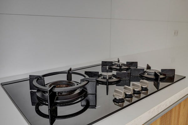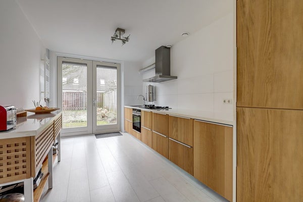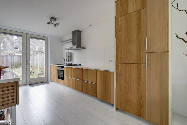 Aan de achterzijde bevindt zich de open keuken met een keukenblok in wandopstelling. Deze beschikt over diverse inbouwapparatuur zoals een gaskookplaat, afzuigkap, koelkast, vriezer, vaatwasser en een oven. Hier bevinden zich dubbele openslaande deuren met toegang naar de achtertuin.