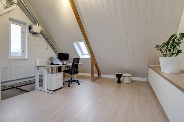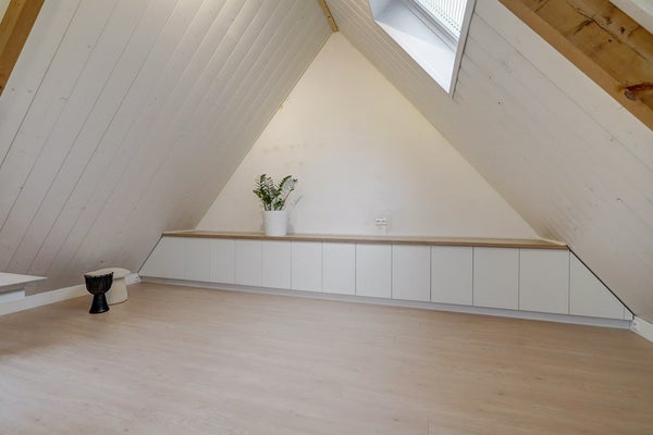 Via een vaste trap bereikt u de tweede verdieping. Hier vindt een flinke open ruimte met aansluiting C,v.-installatie en voorzien van een dakraam. Deze ruime zolder biedt u de mogelijkheid tot het creëren van een of twee extra slaapkamers.